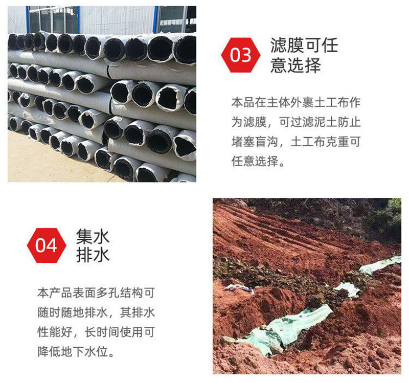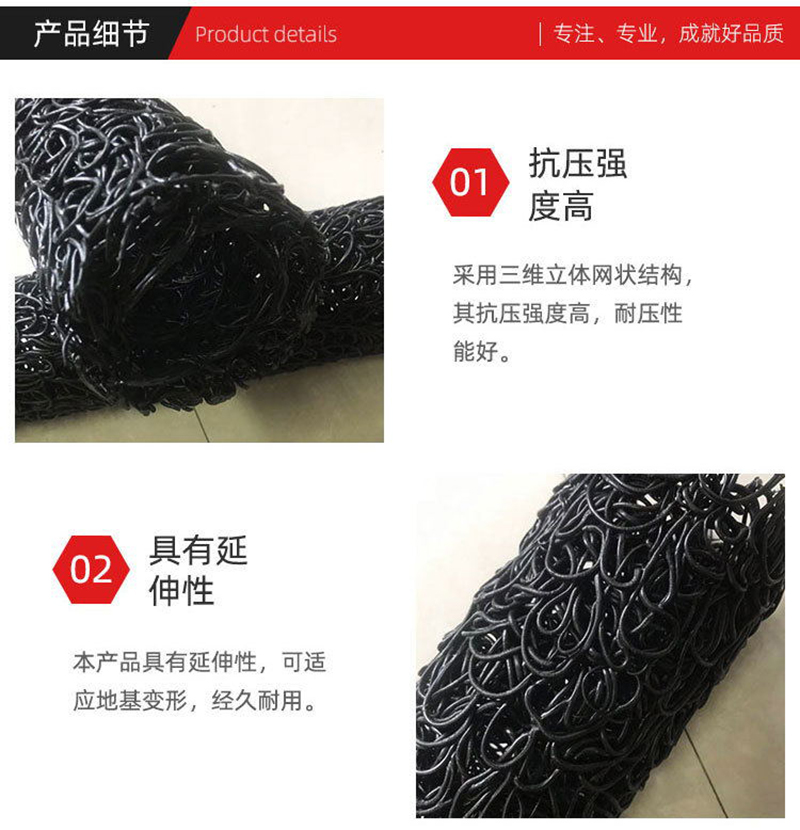 2、由于是立體結(jié)構(gòu),其空隙率為80-95%,構(gòu)成空間與管理同且輕便,抗壓性能比管結(jié)構(gòu)的樹脂強(qiáng)10倍以上,因此,即使因超負(fù)荷被壓,但由于是立體結(jié)構(gòu),故殘余空隙也達(dá)50%以上,不存在不通水的問題,無需考慮會(huì)被土壓力壓壞。